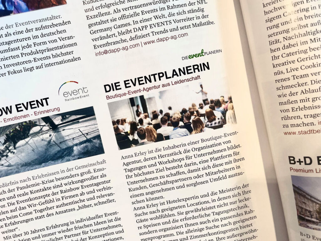Sie haben mich ausgewählt, weil ich mich als Boutique-Eventagentur von den großen Agenturen unterscheide. Ich kannte bis dahin den Begriff „Boutique-Eventagentur“ gar nicht. Aber was soll ich sagen: Er gefällt mir!